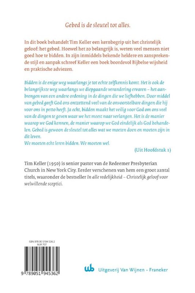 In dit prachtige boek behandelt Tim Keller een kernbegrip uit het christelijk geloof: het gebed. Hoewel het zo belangrijk is, weten veel mensen niet goed hoe te bidden. In zijn inmiddels bekende heldere en aansprekende stijl en aanpak schreef Keller een boek boordevol Bijbelse wijsheid en praktische adviezen.
