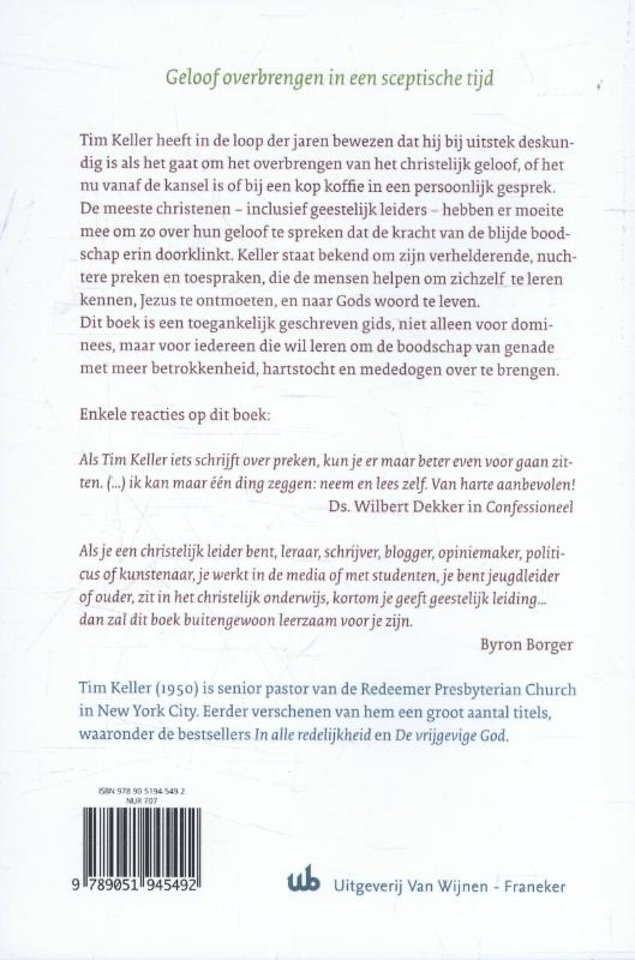 De meeste christenen - inclusief geestelijk leiders - hebben er moeite mee om zo over hun geloof te spreken dat de kracht van de blijde boodschap erin doorklinkt. Tim Keller staat bekend om zijn verhelderende,s nuchtere preken en toespraken, die de mensen helpen om zichzelf te leren kennen, Jezus te ontmoeten, en naar Gods woord te leven. In dit nieuwe boek, een toegankelijk geschreven gids voor dominees én gemeenteleden, helpt Keller zijn lezers hoe ze kunnen leren om de christelijke boodschap van genade aan te bieden met meer betrokkenheid, hartstocht en mededogen.