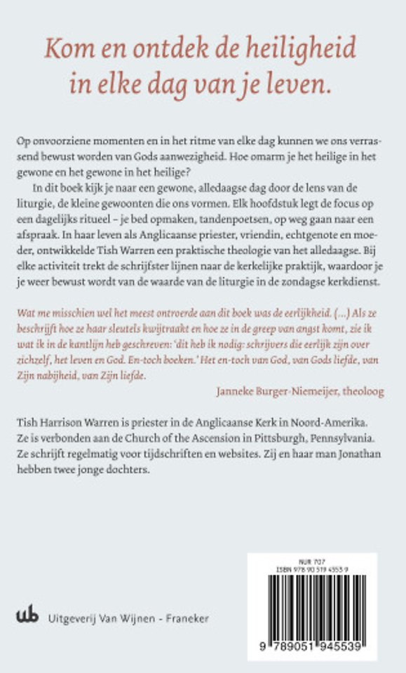 Ingekaderd in de beschrijving van een gewone dag, verkent dit boek het dagelijks leven door de lens van liturgie, kleine praktijken en gewoonten die ons vormen. Elk hoofdstuk kijkt naar iets – haar bed opmaken, haar tanden poetsen, haar sleutels kwijtraken – wat de schrijfster elke dag doet. Op basis van de diversiteit van haar leven als Anglicaanse priester, vriend, echtgenote en moeder, ontwikkelt Tish Warren een praktische theologie van het alledaagse. Elke activiteit is verbonden met een spirituele oefening en een aspect van de zondagse kerkdienst.