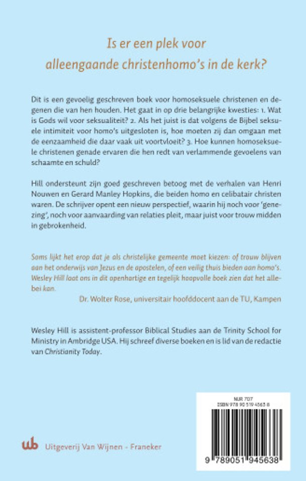 Hill ondersteunt zijn goed geschreven betoog met de verhalen van Henri Nouwen en Gerard Manley Hopkins, die beiden homo en celibatair christen waren. De schrijver opent een nieuw perspectief, waarin hij noch voor ‘genezing’, noch voor aanvaarding van relaties pleit, maar juist voor trouw midden in gebrokenheid.