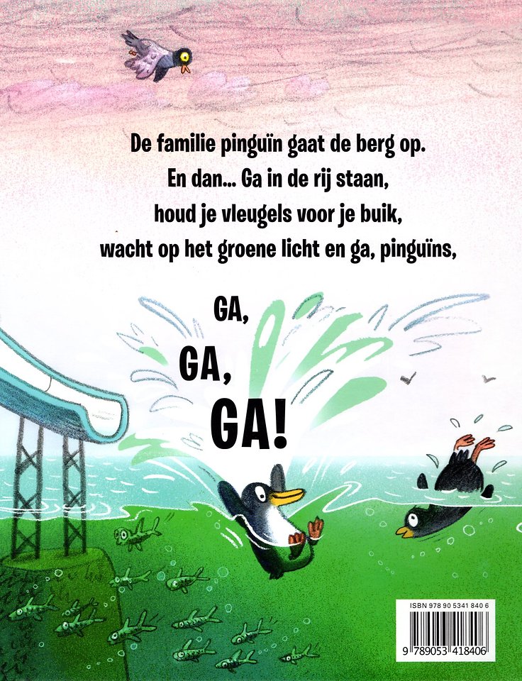 De familie pinguïn gaat de berg op. En dan... Ga in de rij staan, houd je vleugels voor je buik, wacht op het groene licht en ga pinguïns, GA, GA, GA!