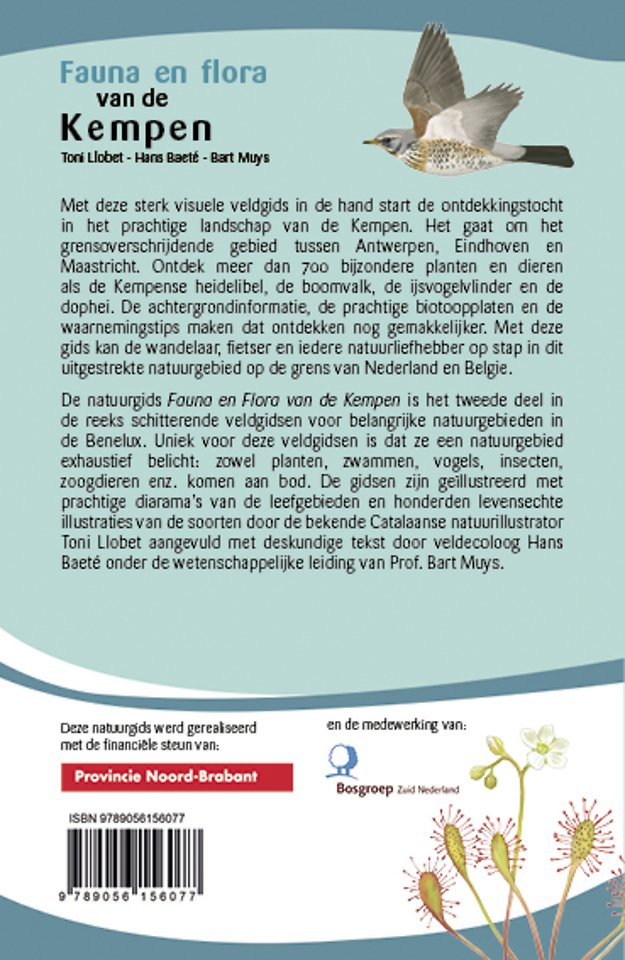 Met deze sterk visuele veldgids in de hand start de ontdekkingstocht in het prachtige landschap van de Kempen. Het gaat om het grensoverschrijdende gebied tussen Antwerpen, Eindhoven en Maastricht. Ontdek meer dan 700 bijzondere planten en dieren als de Kempense heidelibel, de boomvalk, de ijsvogelvlinder en de dophei. De achtergrondinformatie, de prachtige biotoopplaten en de waarnemingstips maken dat ontdekken nog gemakkelijker. Met deze gids kan de wandelaar, fietser en iedere natuurliefhebber op stap in dit uitgestrekte natuurgebied op de grens van Nederland en Belgie. De natuurgids Fauna en Flora van de Kempen is het tweede deel in de reeks schitterende veldgidsen voor belangrijke natuurgebieden in de Benelux. Uniek voor deze veldgidsen is dat ze een natuurgebied exhaustief belicht: zowel planten, zwammen, vogels, insecten, zoogdieren enz. komen aan bod. De gidsen zijn geïllustreerd met prachtige diarama’s van de leefgebieden en honderden levensechte illustraties van de soorten door de bekende Catalaanse natuurillustrator