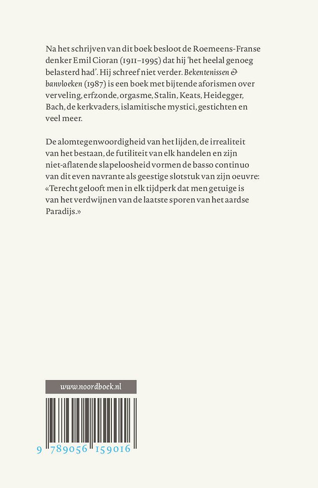 Na het schrijven van dit boek besloot de Roemeens-Franse denker Emil Cioran (1911–1995) dat hij ‘het heelal genoeg belasterd had’. Hij schreef niet verder. Bekentenissen & banvloeken (1987) is een boek met bijtende aforismen over verveling, erfzonde, orgasme, Stalin, Keats, Heidegger, Bach, de kerkvaders, islamitische mystici, gestichten en veel meer.