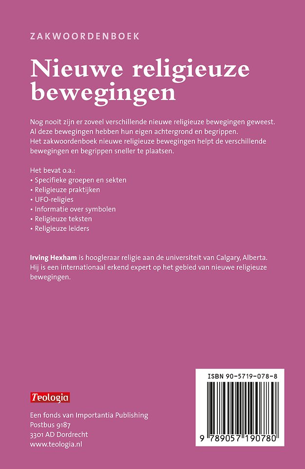 Nog nooit zijn er zoveel verschillende nieuwe religieuze bewegingen geweest. Al deze bewegingen hebben hun eigen achtergrond en begrippen. Het zakwoordenboek nieuwe religieuze bewegingen helpt de verschillende bewegingen en begrippen sneller te plaatsen. Het bevat o.a.: