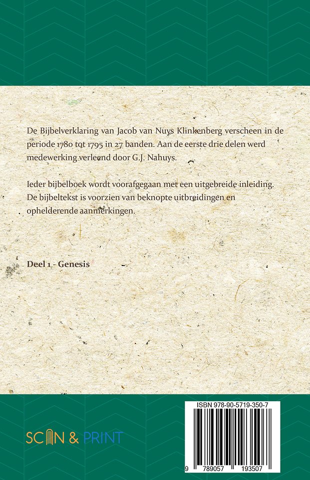 De Bijbelverklaring van Jacob van Nuys Klinkenberg verscheen in de periode 1780 tot 1795 in 27 banden. Aan de eerste drie delen werd medewerking verleend door G.J. Nahuys.