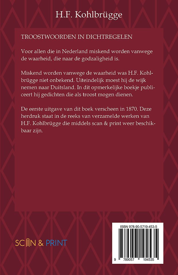 Miskend worden vanwege de waarheid was H.F. Kohlbrügge niet onbekend. Uiteindelijk moest hij de wijk nemen naar Duitsland. In dit opmerkelijke boekje publiceert hij gedichten die als troost mogen dienen.