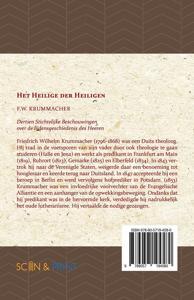 Friedrich Wilhelm Krummacher (1796-1868) was een Duits theoloog. Hij trad in de voetsporen van zijn vader door ook theologie te gaan studeren (Halle en Jena) en werkt als predikant in Frankfurt am Main (1819), Ruhrort (1823), Gemarke (1825) en Elberfeld (1834). In 1843 vertrok hij naar de Verenigde Staten, weigerde daar een benoeming tot hoogleraar en keerde terug naar Duitsland. In 1847 accepteerde hij een beroep in Berlin en werd vervolgens hofprediker in Potsdam. (1853) Krummacher was een invloedrijke voorvechter van de Evangelische Alliantie en een aanhanger van de opwekkingsbeweging. Ondanks dat hij predikant was in de hervormde kerk, verdedigde hij nadrukkelijk het oude lutheranisme. Hij vertaalde de nodige gezangen.