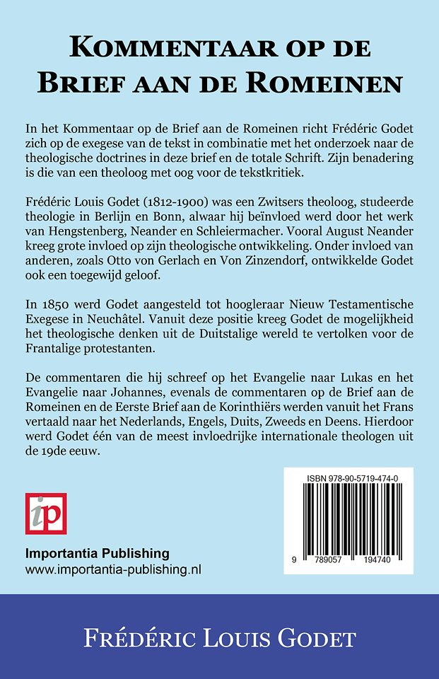 In het Kommentaar op de Brief aan de Romeinen richt Frédéric Godet zich op de exegese van de tekst in combinatie met het onderzoek naar de theologische doctrines in deze brief en de totale Schrift. Zijn benadering is die van een theoloog met oog voor de tekstkritiek.