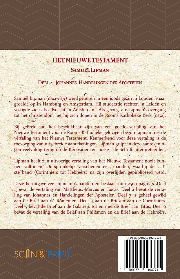 Lipman heeft zijn uitvoerige vertaling van het Nieuwe Testament nooit kunnen voltooien. Oorspronkelijk verschenen er 3 banden, waarbij de laatste band (Corinthiërs tot Hebreërs) na zijn overlijden gepubliceerd werd.