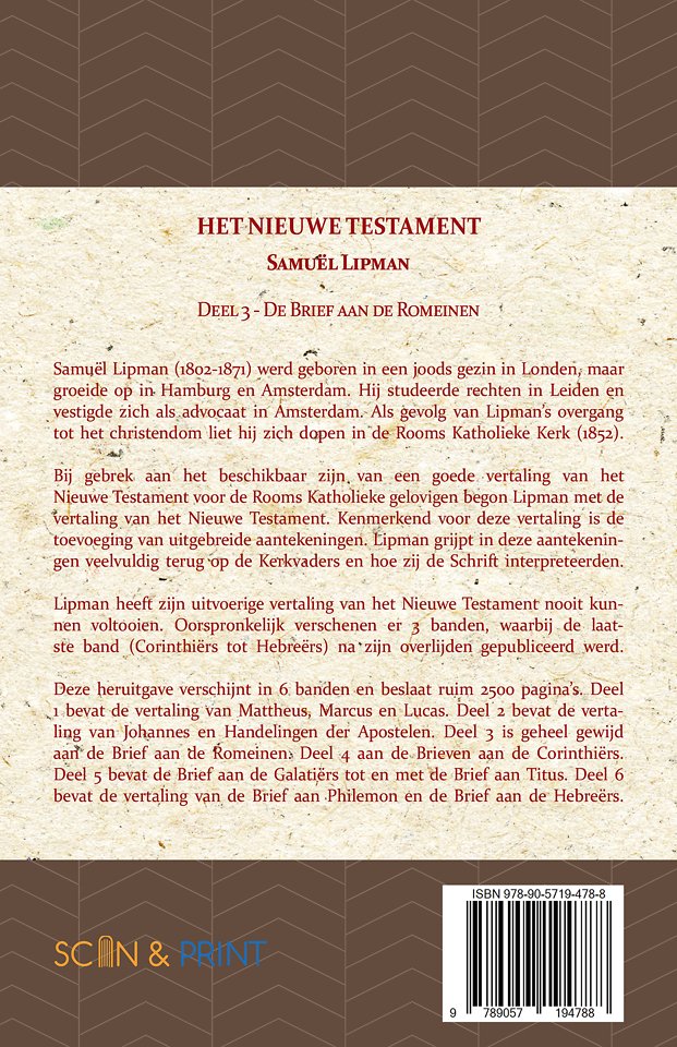 Lipman heeft zijn uitvoerige vertaling van het Nieuwe Testament nooit kunnen voltooien. Oorspronkelijk verschenen er 3 banden, waarbij de laatste band (Corinthiërs tot Hebreërs) na zijn overlijden gepubliceerd werd.