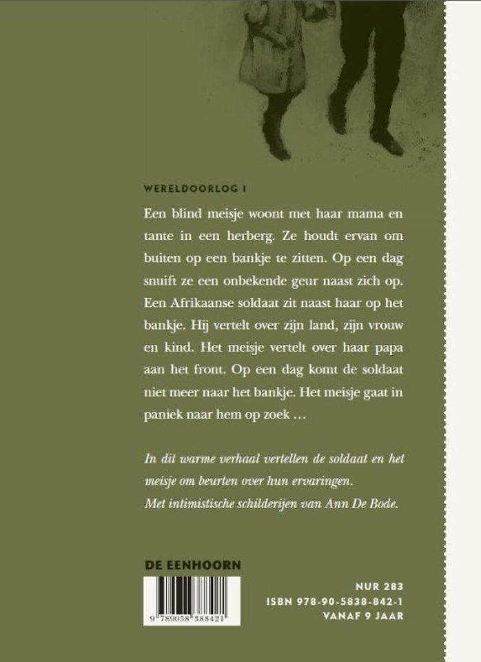 Wereldoorlog I. Een blind meisje woont met haar mama en tante in een herberg. Haar papa is aan het front. Het meisje houdt ervan om buiten op een bankje te zitten. Op een dag snuift het meisje een onbekende geur naast zich op. Er blijkt een Afrikaanse soldaat op het bankje te zitten. Hij is erg ongelukkig in dit koude land en mist zijn vrouw en zoontje. Elke dag dat hij niet aan het front is, komt hij naar het bankje. Hij vertelt het meisje over zijn land, zij vertelt over haar papa. Op een dag is de soldaat er niet. Het meisje is in paniek. Ze gaat naar hem op zoek...