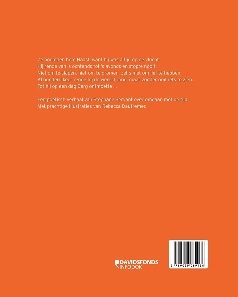 Ze noemden hem Haast, want hij was altijd op de vlucht.Hij rende van ’s ochtends tot ’s avonds en stopte nooit.Niet om te slapen, niet om te dromen, zelfs niet om lief te hebben.Al honderd keer rende hij de wereld rond, maar zonder ooit iets te zien.Tot hij op een dag Berg ontmoette ...Een poëtisch verhaal van Stéphane Servant over omgaan met de tijd. Met prachtige illustraties van Rébecca Dautremer.