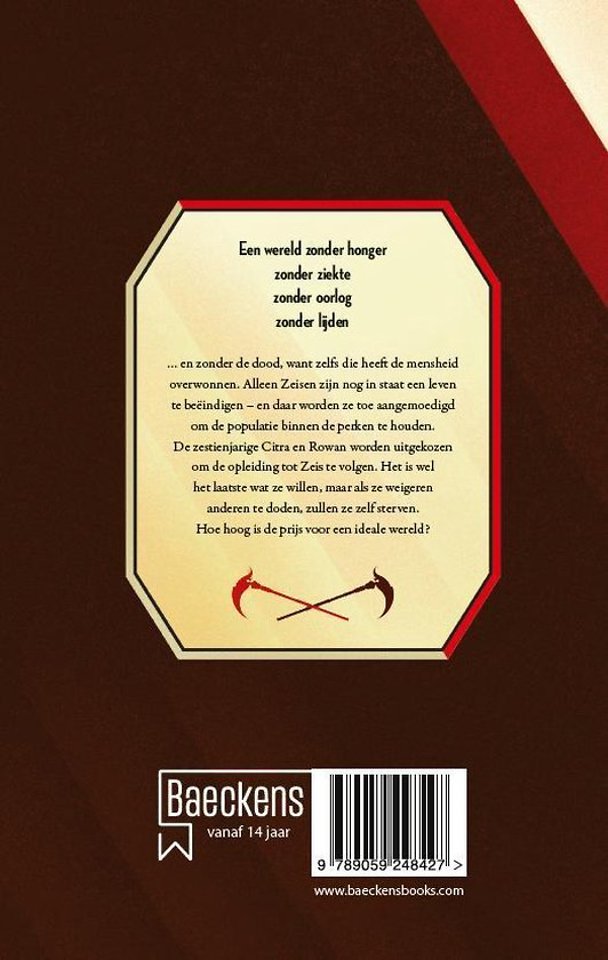 … en zonder de dood, want zelfs die heeft de mensheid overwonnen. Alleen Zeisen zijn nog in staat een leven te beëindigen – en daar worden ze toe aangemoedigd om de populatie binnen de perken te houden. De zestienjarige Citra en Rowan worden uitgekozen om de opleiding tot Zeis te volgen. Het is wel het laatste wat ze willen, maar als ze weigeren anderen te doden, zullen ze zelf sterven. Hoe hoog is de prijs voor een ideale wereld?