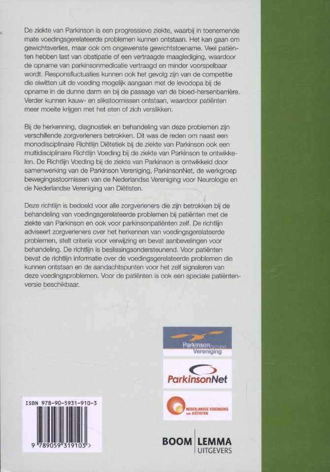 Bij de herkenning, diagnostiek en behandeling van deze problemen zijn verschillende zorgverleners betrokken. Dit was de reden om naast een monodisciplinaire Richtlijn Diëtetiek bij de ziekte van Parkinson ook een multidisciplinaire Richtlijn Voeding bij de ziekte van Parkinson te ontwikkelen. De Richtlijn Voeding bij de ziekte van Parkinson is ontwikkeld door samenwerking van de Parkinson Vereniging, ParkinsonNet, de werkgroep bewegingsstoornissen van de Nederlandse Vereniging voor Neurologie en de Nederlandse Vereniging van Diëtisten.
