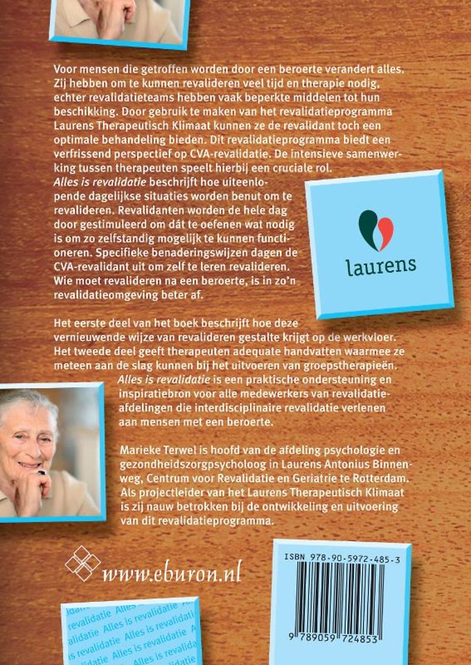 Marieke Terwel is hoofd van de afdeling psychologie en gezondheidszorgpsycholoog in Laurens Antonius Binnenweg, Centrum voor Revalidatie en Geriatrie te Rotterdam. Als projectleider van het Laurens Therapeutisch Klimaat is zij nauw betrokken bij de ontwikkeling en uitvoering van dit revalidatieprogramma.
