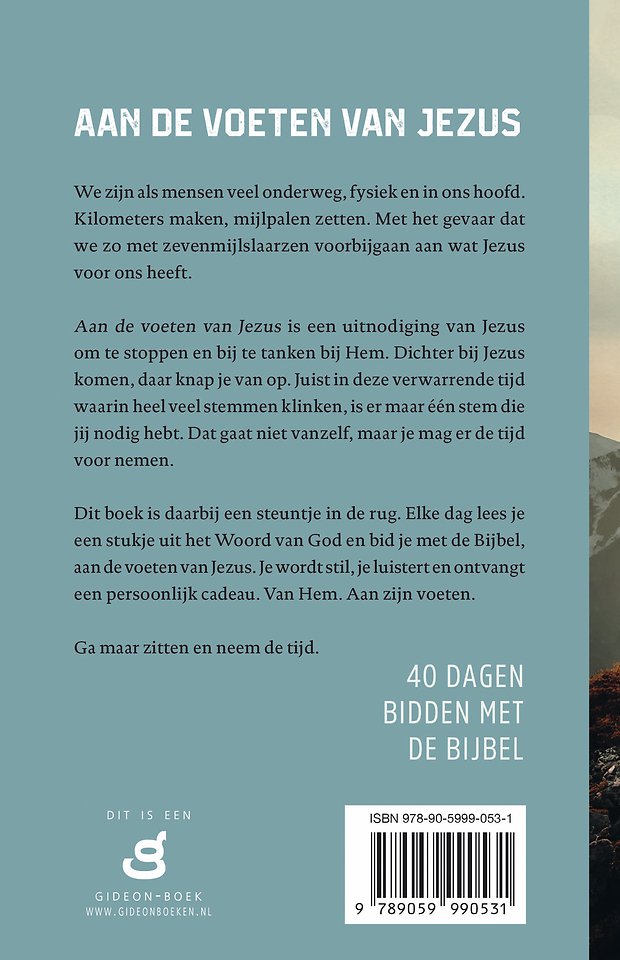 Dit boek is daarbij een steuntje in de rug. Elke dag lees je een stukje uit het Woord van God en bid je met de Bijbel, aan de voeten van Jezus. Je wordt stil, je luistert en ontvangt een persoonlijk cadeau. Van Hem. Aan zijn voeten.