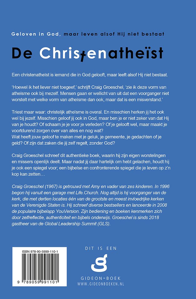 Een christenatheïst is iemand die in God gelooft, maar leeft alsof Hij niet bestaat. 'Hoewel ik het liever niet toegeef,' schrijft Craig Groeschel, 'zie ik deze vorm van atheïsme ook bij mezelf. Mensen gaan er wellicht van uit dat een voorganger niet worstelt met welke vorm van atheïsme dan ook, maar dat is een misverstand.' Triest maar waar: christelijk atheïsme is overal. En misschien herken jij het ook wel bij jezelf. Misschien geloof jij ook in God, maar ben je er niet zeker van dat Hij van je houdt? Of schaam je je voor je verleden? Of je gelooft wel, maar maakt je voortdurend zorgen over van alles en nog wat?