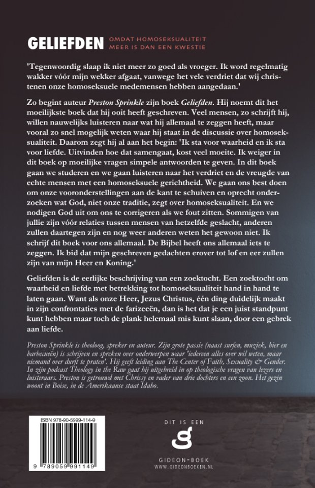 Zo begint auteur Preston Sprinkle zijn boek Geliefden. Hij noemt dit het moeilijkste boek dat hij ooit heeft geschreven. Veel mensen, zo schrijft hij, willen nauwelijks luisteren naar wat hij allemaal te zeggen heeft, maar vooral zo snel mogelijk weten waar hij staat in de discussie over homoseksualiteit. Daarom zegt hij al aan het begin: 'Ik sta voor waarheid en ik sta voor liefde. Uitvinden hoe dat samengaat, kost veel moeite. Ik weiger in dit boek op moeilijke vragen simpele antwoorden te geven. In dit boek gaan we studeren en we gaan luisteren naar het verdriet en de vreugde van echte mensen met een homoseksuele gerichtheid. We gaan ons best doen om onze vooronderstellingen aan de kant te schuiven en oprecht onder- zoeken wat God, niet onze traditie, zegt over homoseksualiteit. En we nodigen God uit om ons te corrigeren als we fout zitten. Sommigen van jullie zijn vóór relaties tussen mensen van hetzelfde geslacht, anderen zullen daartegen zijn en nog weer anderen weten het gewoon niet. Ik schrijf dit boek voor ons allemaal. De Bijbel heeft ons allemaal iets te zeggen. Ik bid dat mijn geschreven gedachten erover tot lof en eer zullen zijn van mijn Heer en Koning.'