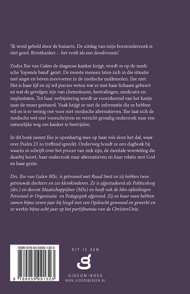 In dit boek neemt Ilse je heel openhartig mee op haar reis door het dal, waarover Psalm 23 zo treffend spreekt. Onderweg houdt ze een dagboek bij waarin ze schrijft over het proces van ziek zijn, de mentale worsteling die daarbij hoort, haar onderzoek naar alternatieven en haar relatie met God en haar gezin.