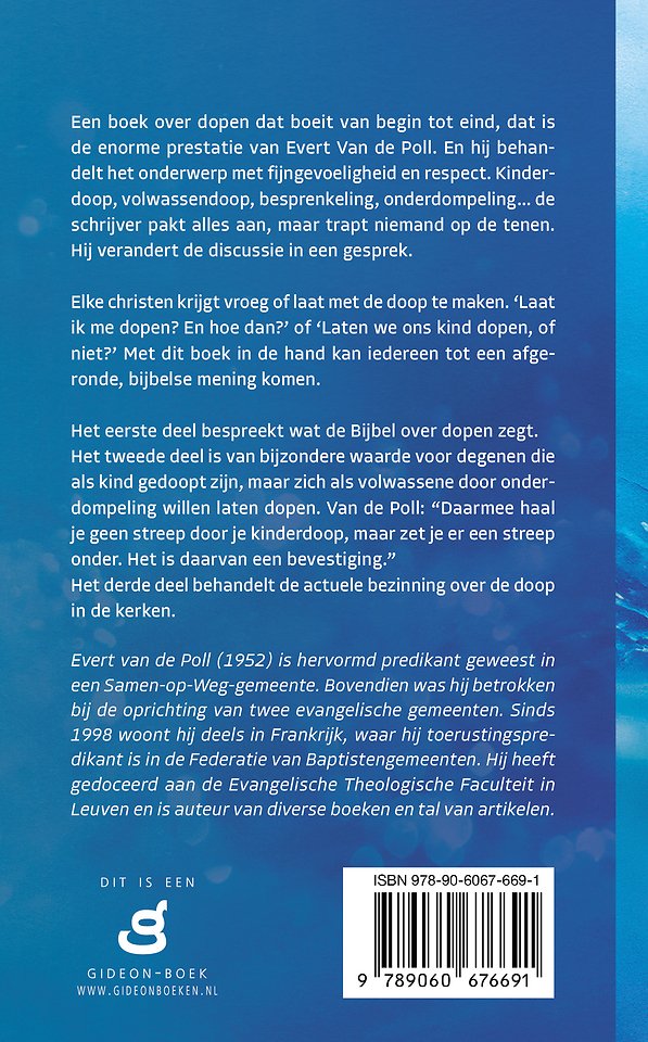 Een boek over dopen dat boeit van begin tot eind, dat is de enorme prestatie van Evert van der Poll. En hij behandelt het onderwerp met fijngevoeligheid en respect. Kinderdoop, volwassendoop, besprenkeling, onderdompeling… De schrijver pakt alles aan, maar trapt niemand op de tenen. Hij verandert de discussie in een gesprek.