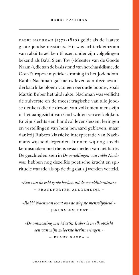 De legendarische Rabbi Nachman stond aan het einde van een ononderbroken overlevering die uitmondde in de chassidische traditie, de "wonderbaarlijke bloem van een oeroude boom", zoals Martin Buber het uitdrukte. Toen het chassidisme ten onder ging, stond nog eenmaal een grote vernieuwer op om de "de kroon haar oude luister terug te geven". Dit was Rabbi Nachman ben Simcha, wellicht de zuiverste en de meest tragische van alle joodse denkers die de droom van extatisch mens-zijn in het aangezicht van God wilden verwerkelijken. Er zijn slechts enkele levenslessen, leringen en vertellingen van Rabbi Nachman bewaard gebleven, maar dankzij de klassieke en overal ter wereld vertaalde bundeling en bewerking door Martin Buber kunnen wij nog steeds kennismaken met zijn "waarheden van het hart". De geschiedenissen en sprookjes die Rabbi Nachman vertelt, hebben nog dezelfde poëtische kracht en fundamentele innerlijke waarde als op de dag dat zij werden verteld.