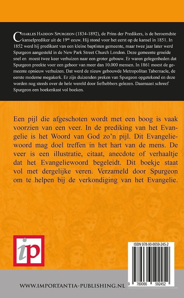 Een pijl die afgeschoten wordt met een boog is vaak voorzien van een veer. In de prediking van het Evangelie is het Woord van God zo'n pijl. Dit Evangeliewoord mag doel treffen in het hart van de mens. De veer is een illustratie, citaat, anecdote of verhaaltje dat het Evangeliewoord begeleidt. Dit boekje staat vol met dergelijke veren. Verzameld door Spurgeon om te helpen bij de verkondiging van het Evangelie.