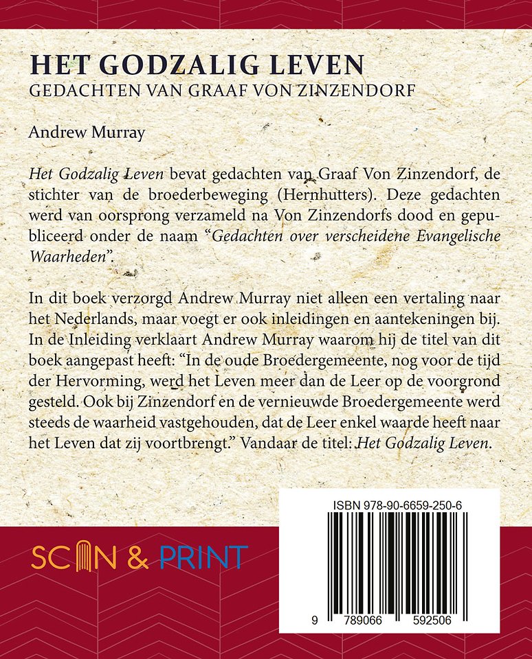 In dit boek verzorgd Andrew Murray niet alleen een vertaling naar het Nederlands, maar voegt er ook inleidingen en aantekeningen bij. In de Inleiding verklaart Andrew Murray waarom hij de titel van dit boek aangepast heeft: "In de oude Broedergemeente, nog voor de tijd der Hervorming, werd het Leven meer dan de Leer op de voorgrond gesteld. Ook bij Zinzendorf en de vernieuwde Broedergemeente werd steeds de waarheid vastgehouden, dat de Leer enkel waarde heeft naar het Leven dat zij voortbrengt." Vandaar de titel: Gedachten over het Godzalig Leven.