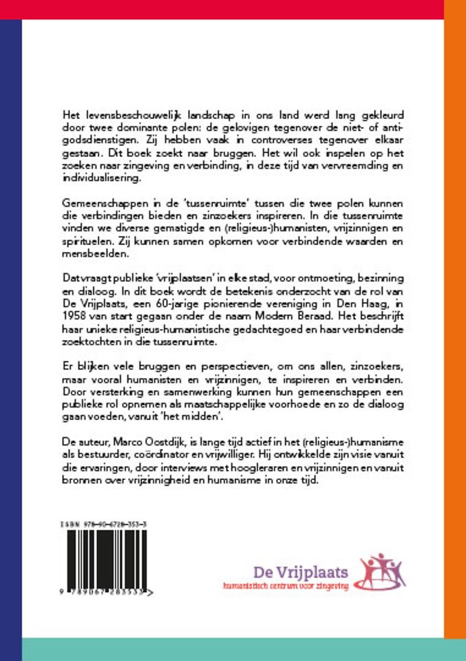 Dat vraagt publieke ‘vrijplaatsen’ in elke stad, voor ontmoeting, bezinning en dialoog. In dit boek wordt de betekenis onderzocht van de rol van De Vrijplaats, een 60 jarige pionierende vereniging in Den Haag, in 1958 van start gegaan onder de naam Modern Beraad. Het beschrijft haar unieke religieus-humanistische gedachtegoed en haar verbindende zoektochten in die tussenruimte.