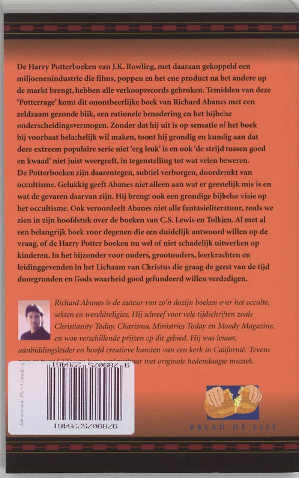 Onschuldige fantasie of gevaarlijke betovering? Eindelijk een diepgaande bijbelse studie in het Nederlands naar alle Harry Potter boeken! Richard Abanes is bekend in de VS als schrijver van boeken over sekten, het occulte en wereldgodsdiensten. Hij analyseert uitgebreid en met kennis van zaken de inhoud en personages van de Potter boeken. Ook vergelijkt hij ze met boeken van C. S. Lewis en J. R. R. Tolkien. Verder omschrijft hij wat occultisme is, de verschillende soorten satanisme, wicca en paganisme. Dit boek helpt u echt verder!