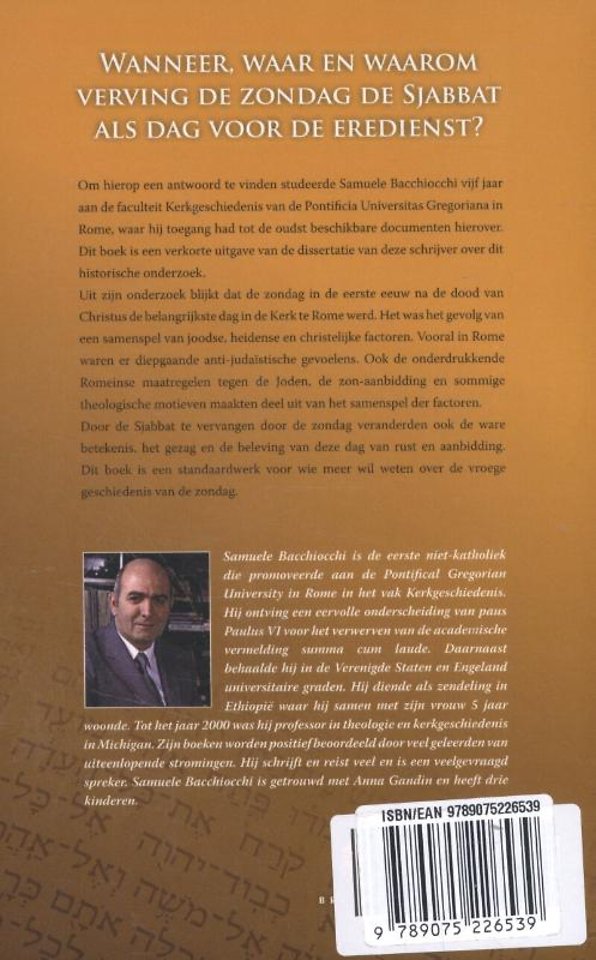 Wanneer, waar en waarom verving de zondag de Sjabbat als dag voor de eredienst? Om hierop een antwoord te vinden studeerde Bacchiocchi vijf jaar aan de faculteit Kerkgeschiedenis in Rome, waar hij toegang had tot de oudst beschikbare documenten hierover. Uit zijn onderzoek blijkt dat de zondag in de eerste eeuw na de dood van Christus de belangrijkste dag in de Kerk te Rome werd. Het was het gevolg van een samenspel van joodse, heidense en christelijke factoren. Vooral in Rome waren er diepgaande anti-judaïstische gevoelens en allerlei maatregelen tegen de Joden. Door de Sjabbat te vervangen door de zondag veranderden ook de ware betekenis, het gezag en de beleving van deze dag van rust en aanbidding. Dit boek is een echt standaardwerk.