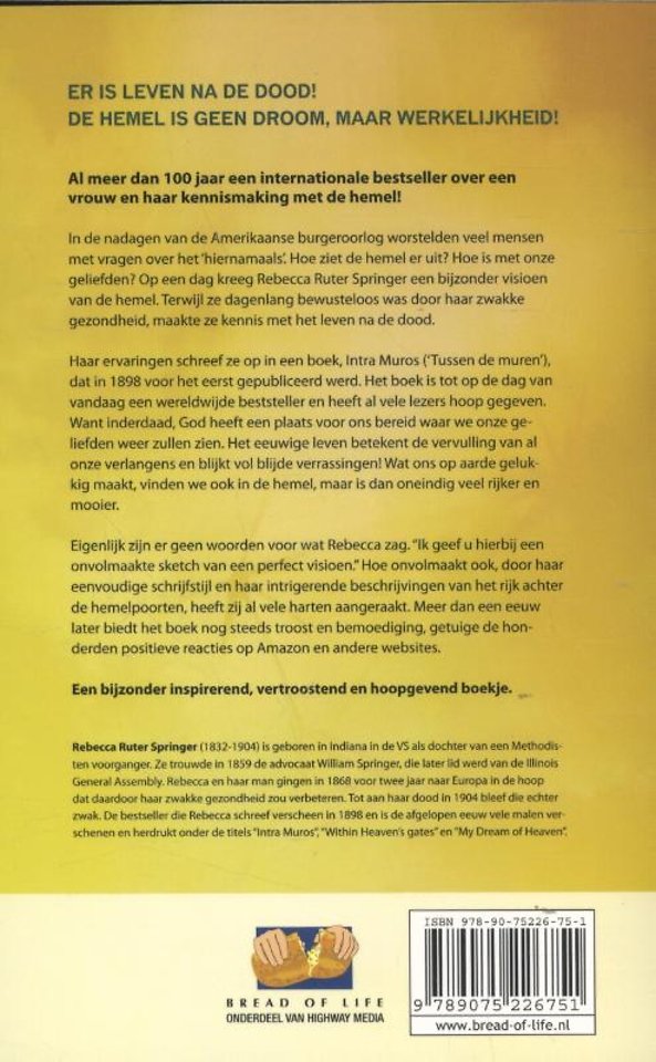 Rebecca Springer kreeg, gedurende een periode van intens lichamelijk lijden, een visioen van de hemel. Een ware, beknopte weergave van een bijzondere ervaring met het leven na de dood. De dingen die ons hier op aarde gelukkig maken zijn ook in de hemel maar dan oneindig veel rijker en mooier door de aanwezigheid van de Heer. Een inspirerend en vertroostend boekje.