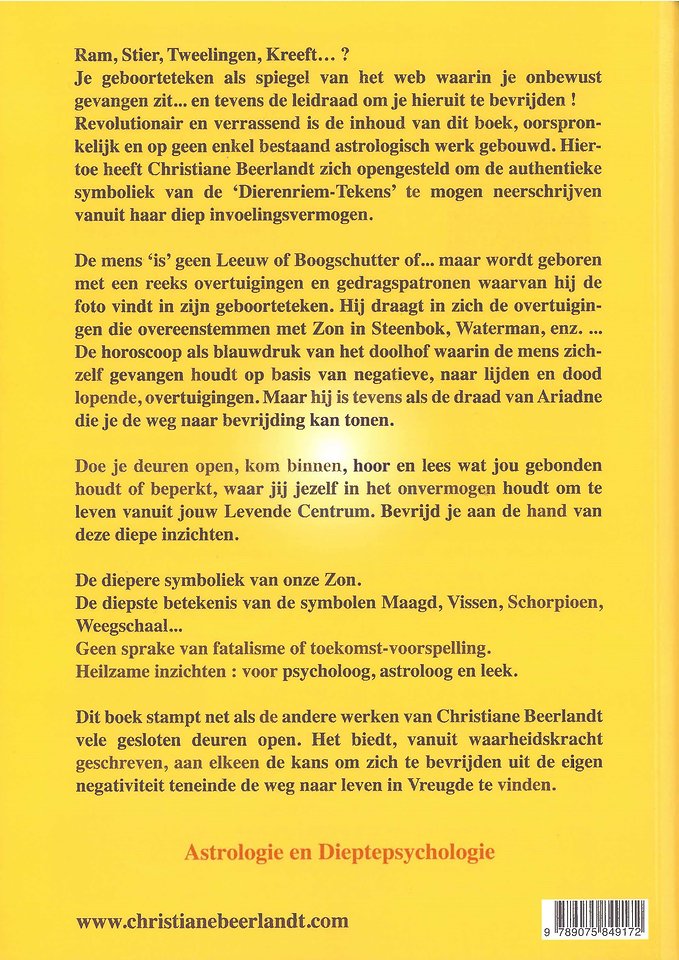 Revolutionair en verrassend is de inhoud van dit boek, oorspronkelijk en op geen enkel bestaand astrologisch werk gebouwd. Hiertoe heeft Christiane Beerlandt zich opengesteld om de authentieke symboliek van de ‘Dierenriem-Tekens’ te mogen neerschrijven vanuit haar diep invoelingsvermogen.