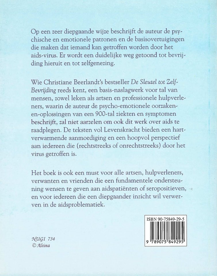 Wie Christiane Beerlandt's bestseller De Sleutel tot Zelf-Bevrijding reeds kent, een basis-naslagwerk voor tal van mensen, zowel leken als artsen en professionele hulpverleners, waarin de auteur de psycho-emotionele oorzaken-en-oplossingen van een 900-tal ziekten en symptomen beschrijft, zal niet aarzelen om ook dit werk over aids te raadplegen. De teksten vol Levenskracht bieden een hartverwarmende aanmoediging en een hoopvol perspectief aan iedereen die (rechtstreeks of onrechtstreeks) door het virus getroffen is.