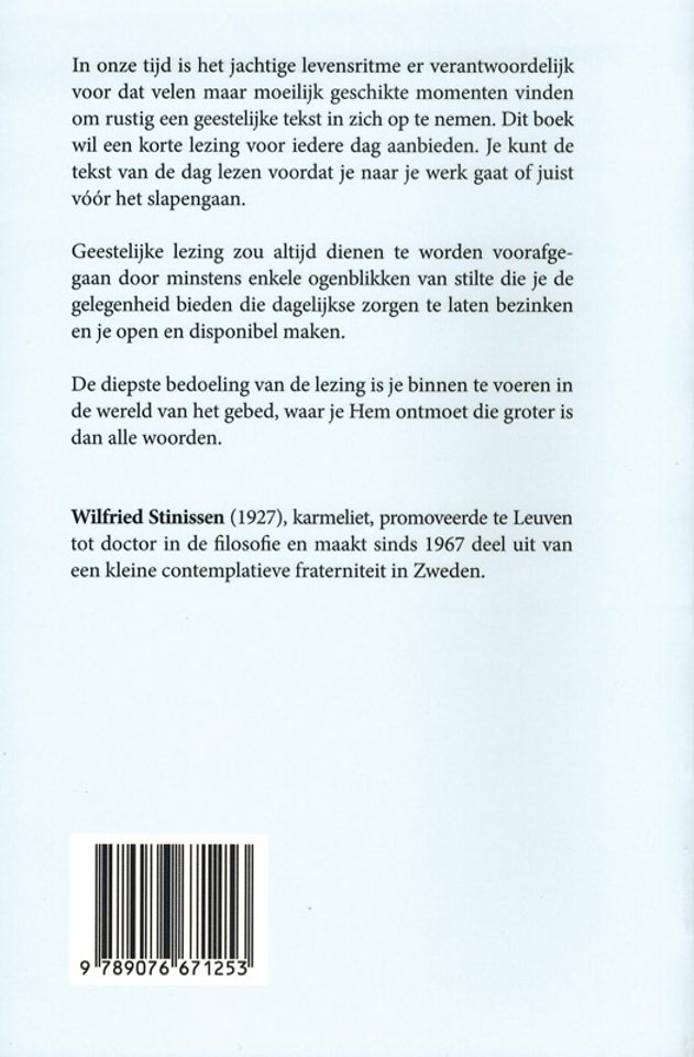 In onze tijd is het jachtige levensritme er verantwoordelijk voor dat velen maar moeilijk geschikte momenten vinden om rustig een geestelijke tekst in zich op te nemen. Dit boek wil een korte lezing voor iedere dag aanbieden. Je kunt de