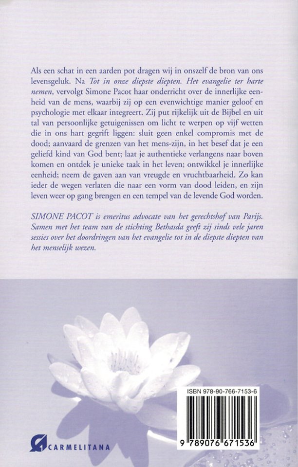 Als een schat in een aarden pot dragen wij in onszelf de bron van ons levensgeluk. De schrijver vervolgt hier haar onderricht over de innerlijke eenheid van de mens, waarbij zij op een evenwichtige manier geloof en psychologie met elkaar integreert. Zij put rijkelijk uit de Bijbel en uit tal van persoonlijke getuigenissen om licht te werpen op vijf wetten die in ons hart gegrift liggen: sluit geen enkel compromis met de dood; aanvaard de grenzen van het mens-zijn, in het besef dat je een geliefd kind van God bent; laat je authentieke verlangens naar boven komen en ontdek je unieke taak in het leven; ontwikkel je innerlijke eenheid; neem de gaven aan van vreugde en vruchtbaarheid.