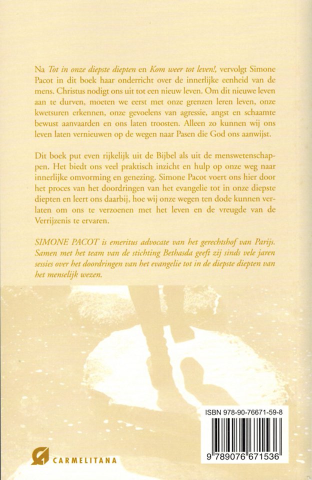 Dit boek put even rijkelijk uit de Bijbel als uit de menswetenschappen. Het biedt ons veel praktisch inzicht en hulp op onze weg naar innerlijke omvorming en genezing. Simon Pacot voert ons hier door het proces van het doordringen van het evangelie tot in onze diepste diepten en leert ons daarbij, hoe wij onze wegen ten dode kunnen verlaten om ons te verzoenen met het leven en de vreugde van de Verrijzenis ervaren.