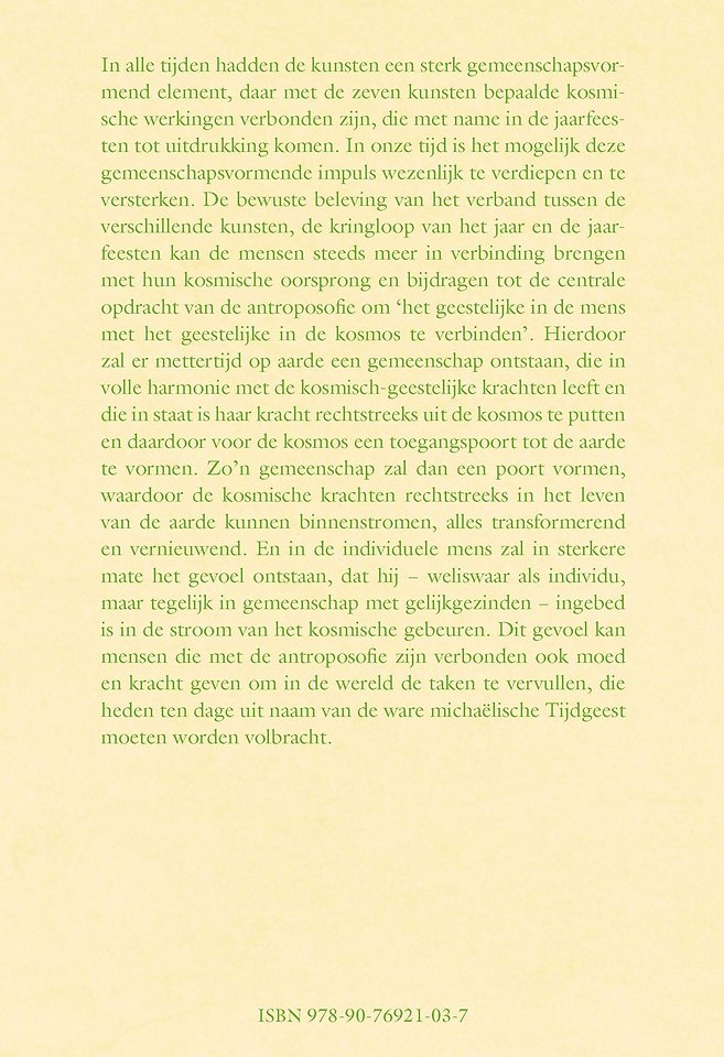 In alle tijden hadden de kunsten een sterk gemeenschapsvormend element, daar met de zeven kunsten bepaalde kosmische werkingen verbonden zijn, die met name in de jaarfeesten tot uitdrukking komen. In onze tijd is het mogelijk deze gemeenschapsvormende impuls wezenlijk te verdiepen en te versterken. De bewuste beleving van het verband tussen de verschillende kunsten, de kringloop van het jaar en de jaarfeesten kan de mensen steeds meer in verbinding brengen met hun kosmische oorsprong en bijdragen tot de centrale opdracht van de antroposofie om ‘het geestelijke in de mens met het geestelijke in de kosmos te verbinden’. Hierdoor zal er mettertijd op aarde een gemeenschap ontstaan, die in volle harmonie met de kosmisch-geestelijke krachten leeft en die in staat is haar kracht rechtstreeks uit de kosmos te putten en daardoor voor de kosmos een toegangspoort tot de aarde te vormen. Zo’n gemeenschap zal dan een poort vormen, waardoor de kosmische krachten rechtstreeks in het leven van de aarde kunnen binnenstromen, alles transformerend en vernieuwend. En in de individuele mens zal in sterkere mate het gevoel ontstaan, dat hij − weliswaar als individu, maar tegelijk in gemeenschap met gelijkgezinden − ingebed is in de stroom van het kosmische gebeuren. Dit gevoel kan mensen die met de antroposofie zijn verbonden ook moed en kracht geven om in de wereld de taken te vervullen, die heden ten dage uit naam van de ware michaëlische Tijdgeest moeten worden volbracht.