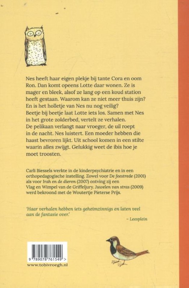 Nes heeft haar eigen plekje bij tante Cora en oom Ron. Dan komt opeens Lotte daar wonen. Ze is mager en bleek, alsof ze lang op een koud station heeft gestaan. Waarom kan ze niet meer thuis zijn? En is het holletje van Nes nu nog veilig? Beetje bij beetje laat Lotte iets los. Samen met Nes in het grote zolderbed, vertelt verhalen. De pelikaan verlangt naar vroeger, de uil roept in de nacht. Nes luistert. Een moeder hebben die haast bevroren lijkt. Uit school komen in een stilte waarin alles zwijgt. Gelukkig weet de ibis hoe je moet troosten.