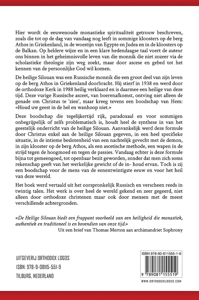 Hier wordt de eeuwenoude monastieke spiritualiteit getrouw beschreven, zoals die tot op de dag van vandaag nog leeft in sommige kloosters op de berg Athos in Griekenland, in de woestijn van Egypte en Judea en in de kloosters op de Balkan. De auteur voert ons binnen in het geheimenisvolle leven van die monnik die niet zozeer via de dogmatische theologie zijn weg zoekt, maar door ascese en gebed tot het kennen van de persoonlijke God wil komen. De heilige Silouan (1866-1938) was een Russische monnik die een groot deel van zijn leven op de berg Athos doorbracht. Hij werd door de orthodoxe Kerk in 1988 heilig verklaard. Deze vurige Russische asceet, van boerenafkomst, ontving niet alleen de genade om Christus te `zien', maar kreeg tevens een boodschap van Hem : Houd uw geest in de hel en wanhoop niet.