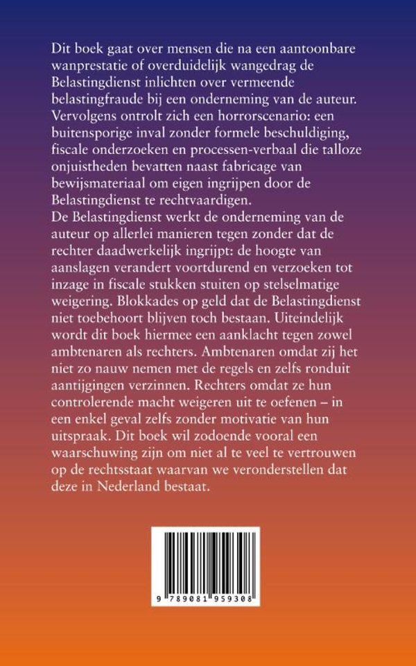 Dit boek gaat over mensen die na een aantoonbare wanprestatie of overduidelijk wangedrag de Belastingdienst inlichten over vermeende belastingfraude bij een onderneming van de auteur. Vervolgens ontrolt zich een horrorscenario: een buitensporige inval zonder formele beschuldiging, fiscale onderzoeken en processen-verbaal die talloze onjuistheden bevatten naast fabricage van bewijsmateriaal om eigen ingrijpen door de Belastingdienst te rechtvaardigen.