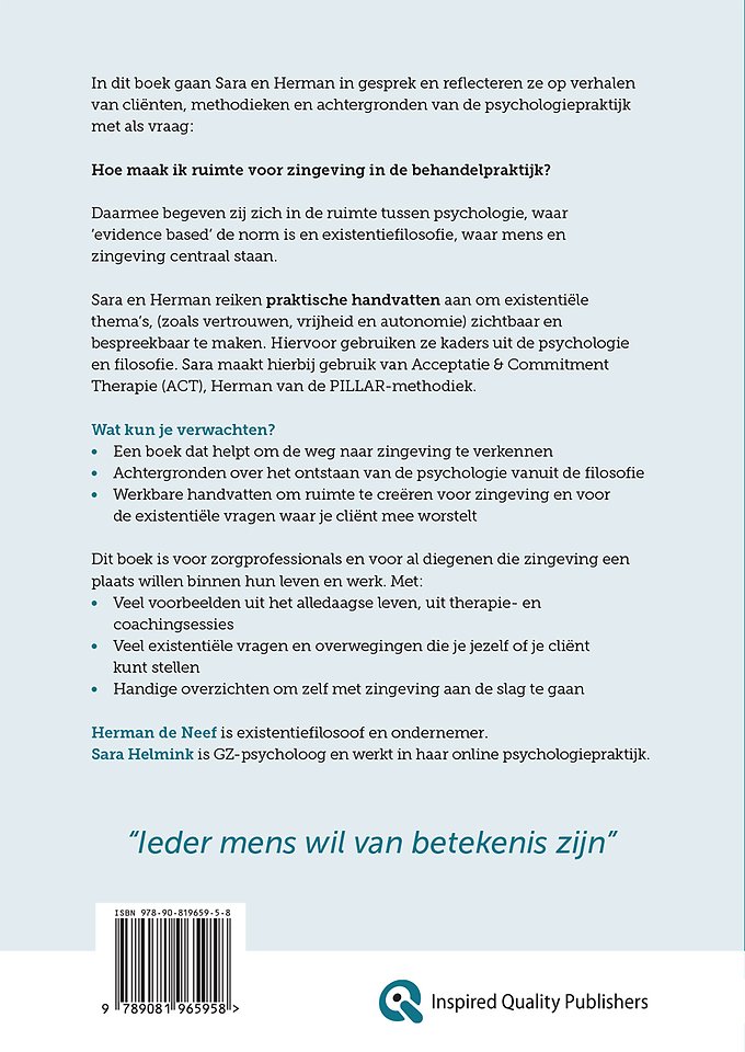 Zij reiken praktische handvatten aan om existentiële thema's, zoals vertrouwen, vrijheid en autonomie zichtbaar en bespreekbaar te maken. Aan de hand van 7 casussen vertelt Sara over de cliënt en de behandeling. Herman reageert hierop vanuit een existentiële insteek. Het boek bevat handige overzichten om zelf met zingeving aan de slag te gaan.
