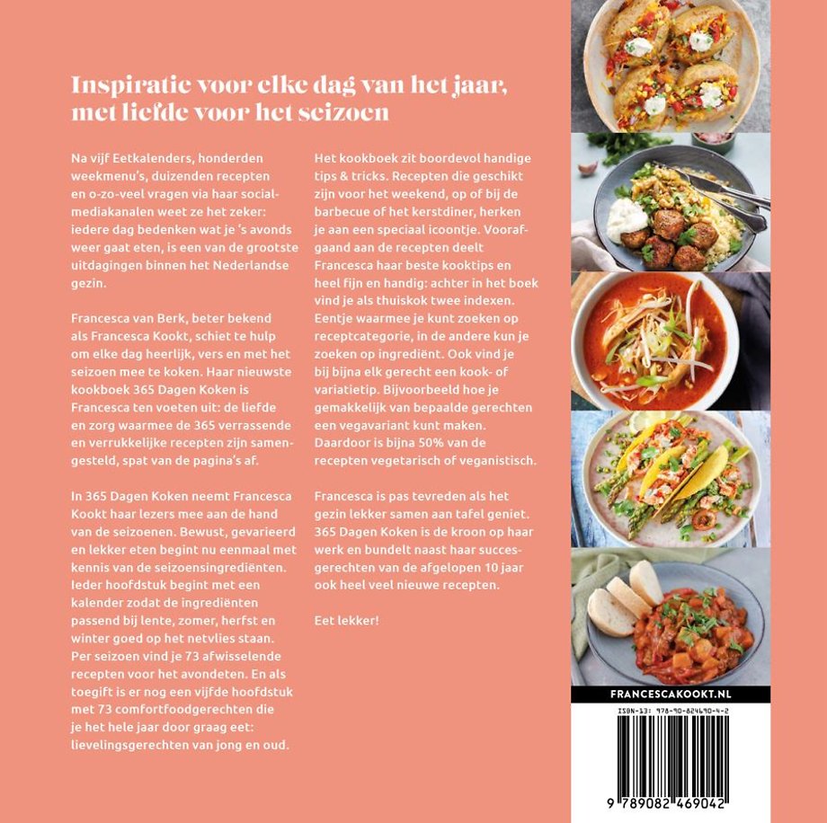 Francesca van Berk, beter bekend als Francesca Kookt, schiet te hulp om als gezin elke dag heerlijk, vers en gevarieerd te koken. In 365 Dagen Koken neemt zij haar lezers mee aan de hand van de seizoenen. Ieder hoofdstuk begint met een groente- en fruitkalender en per seizoen vind je 73 afwisselende recepten voor het avondeten. En als toegift is er nog een vijfde hoofdstuk met 73 comfortfoodgerechten die je het hele jaar door graag eet.