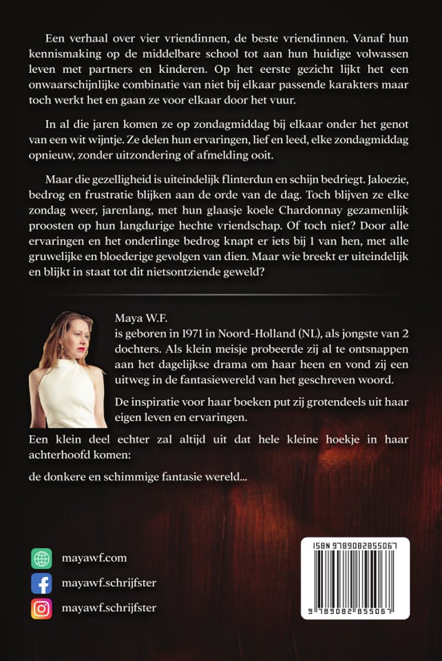 Maar die gezelligheid is uiteindelijk flinterdun en schijn bedriegt. Jaloezie, bedrog en frustratie blijken aan de orde van de dag. Toch blijven ze elke zondag weer, jarenlang, met hun glaasje koele Chardonnay gezamenlijk proosten op hun langdurige hechte vriendschap. Of toch niet? Door alle ervaringen en het onderlinge bedrog knapt er iets bij 1 van hen, met alle gruwelijke en bloederige gevolgen van dien. Maar wie breekt er uiteindelijk en blijkt in staat tot dit nietsontziende geweld?
