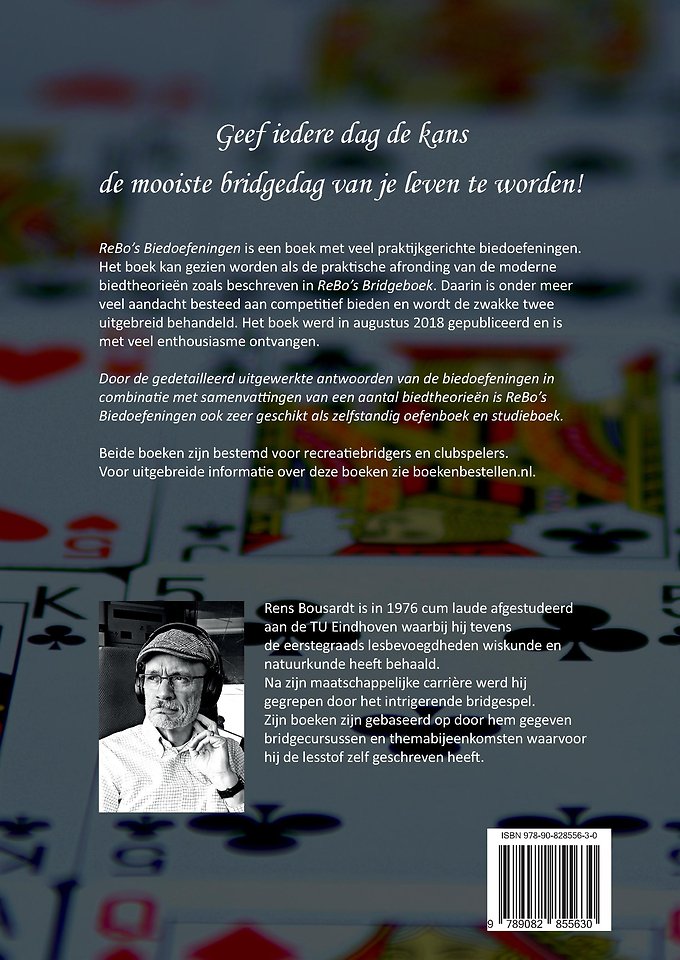 ReBo’s Biedoefeningen (ISBN 978-90-828556-3-0) is een boek van 112 pagina’s met veel praktijkgerichte biedoefeningen welke zijn verdeeld over 12 biedthema’s. Het boek kan gezien worden als de praktische afronding van de moderne biedtheorieën met veel aandacht voor competitief bieden zoals beschreven in ReBo’s Bridgeboek (ISBN 978-90-828556-1-6). Dat boek (160 pagina’s) werd in augustus 2018 gepubliceerd en is met veel enthousiasme ontvangen.