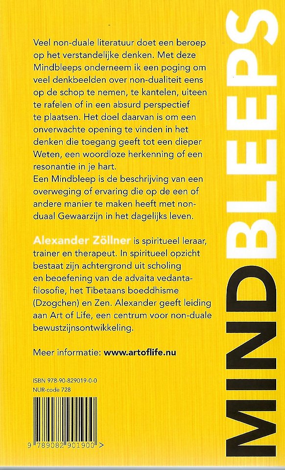 Veel non-duale literatuur doet een beroep op het verstandelijke denken. Met deze Mindbleeps onderneem ik een poging om veel denkbeelden over non-dualiteit eens op de schop te nemen, te kantelen, uiteen te rafelen of in een absurd perspectief te plaatsen. Het doel daarvan is om een onverwachte opening te vinden in het denken die toegang geeft tot een dieper Weten, een woordloze herkenning of een resonantie in je hart.