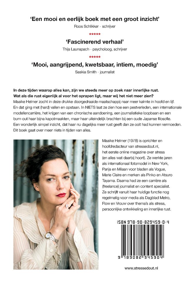 Maaike Helmer zocht in deze drukke doorgedraaide maatschappij naar meer kalmte in hoofd en lijf. En dat ging met (hard) vallen en opstaan. In NIETS laat ze zien hoe een pestverleden, een internationale modellencarrière, het krijgen van een chronische aandoening, een journalistieke loopbaan en een burn-out haar bijna kapotmaakten, maar haar uiteindelijk brachten bij een oude Japanse filosofie. Een wonderlijk simpel inzicht, dat haar nu dagelijks meer rust geeft dan ze ooit had kunnen vermoeden. Dit boek gaat over meer niets in tijden van alles.