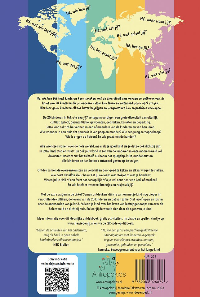 Hé, wie ben jij? laat kinderen kennismaken met de diversiteit mensen en culturen aan de hand 20 kinderen die je meenemen door hun leven en antwoord geven op 9 vragen.