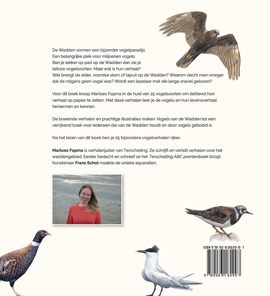 Marloes Fopma is verhalenjutter van Terschelling. Ze schrijft en vertelt verhalen over het waddengebied. Eerder bedacht en schreef ze het Terschelling ABC prentenboek (2019). Kunstenaar Frans Schot maakte de unieke aquarellen.