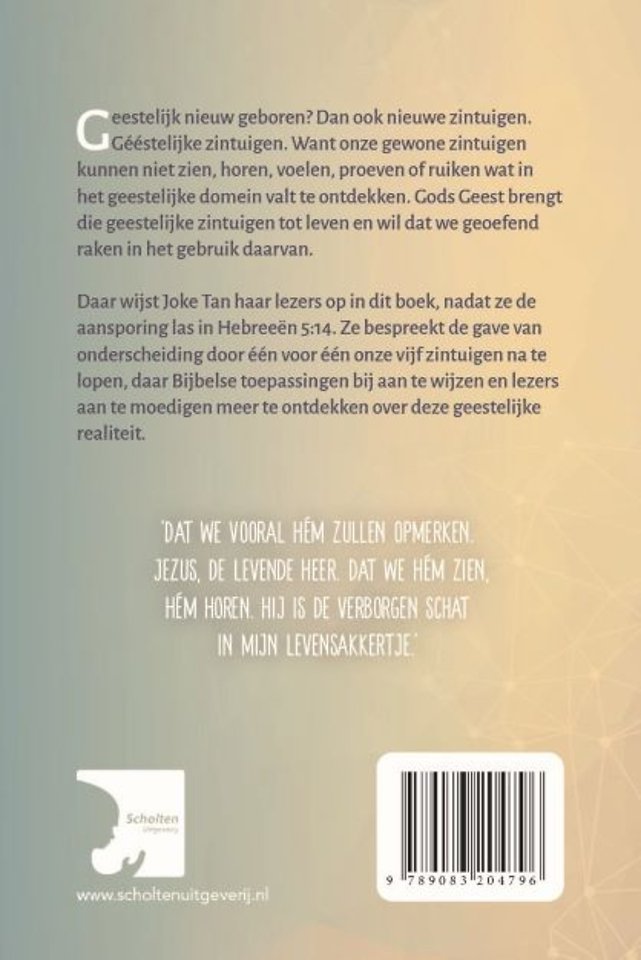 Daar wijst Joke Tan haar lezers op in dit boek, nadat ze de aansporing las in Hebreeën 5:14. Ze bespreekt de gave van onderscheiding door één voor één onze vijf zintuigen na te lopen, daar Bijbelse toepassingen bij aan te wijzen en lezers aan te moedigen meer te ontdekken over deze geestelijke realiteit.
