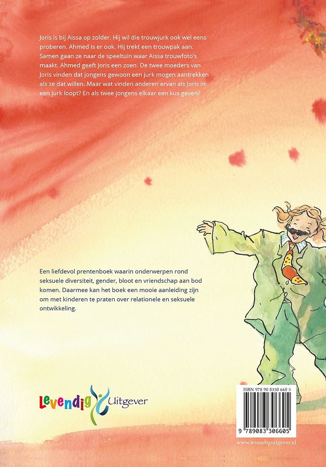 Joris is bij Aissa op zolder. Hij wil die trouwjurk ook wel eens proberen. Ahmed is er ook. Die trekt een trouwpak aan. Samen gaan ze naar de speeltuin waar Aissa trouwfoto’s maakt. Ahmed geeft Joris een zoen. De twee moeders van Joris vinden dat jongens gewoon een jurk mogen aantrekken als ze dat willen. Maar wat vinden anderen ervan als Joris in een jurk loopt? En als twee jongens elkaar een kus geven?